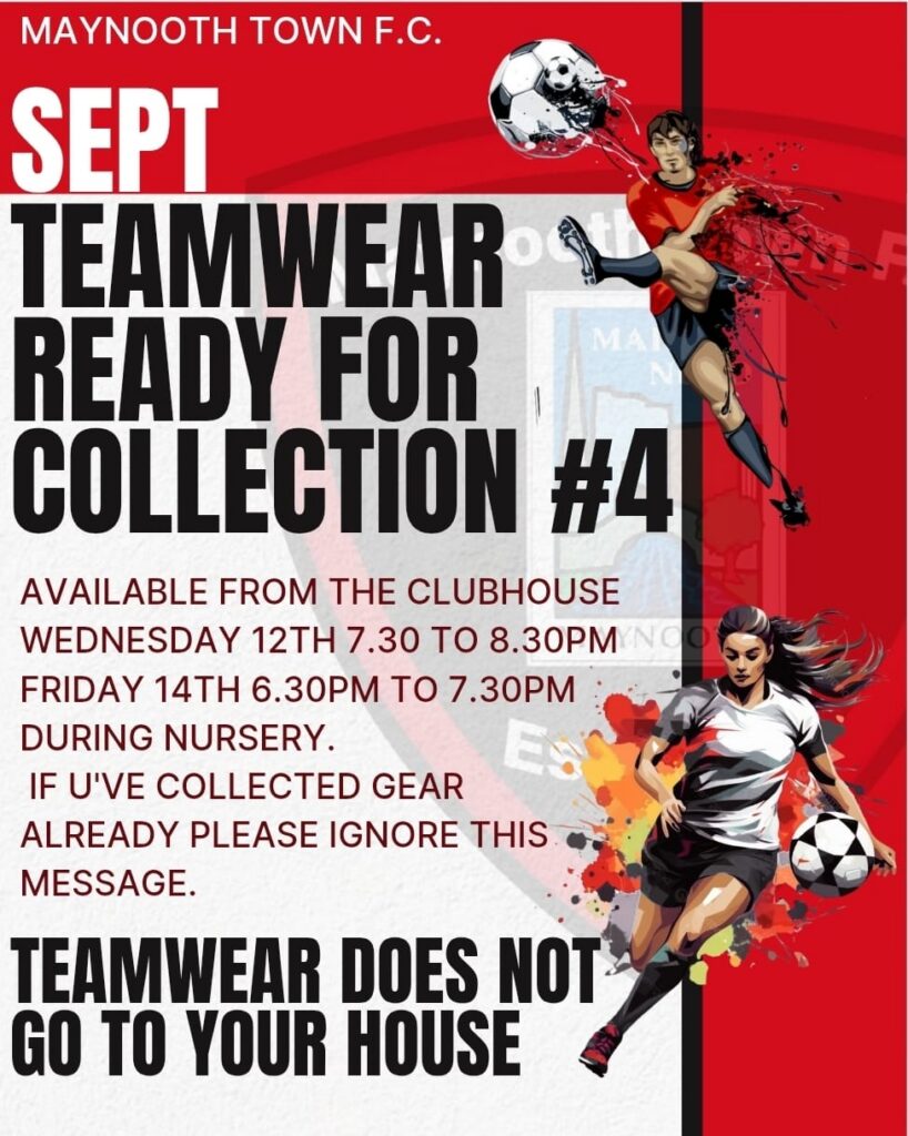 Teamwear for September is now ready for collection! π Clubhouse Collection Times: Wednesday 12th: 7:30 PM β 8:30 PM Friday 14th: 6:30 PM β 7:30
